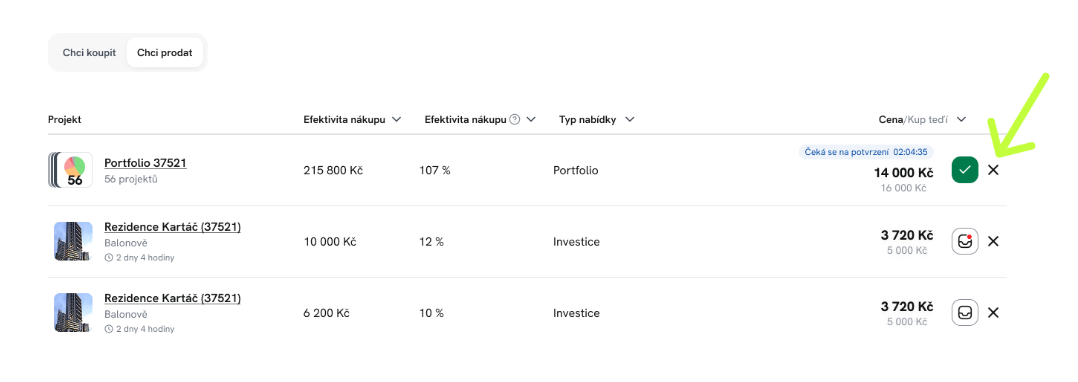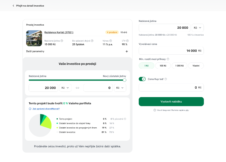 Tato sekce slouží k tomu, abyste mohli nabídnout svou investici ostatním investorům. Získáte tak možnost uvolnit peníze ještě před koncem splácení a umožnit dalším investorům převzít váš projekt. Nemusíte tedy prodávat celou investici. Můžete prodat jen část jistiny, kterou chcete uvolnit, a zbytek si ponechat.