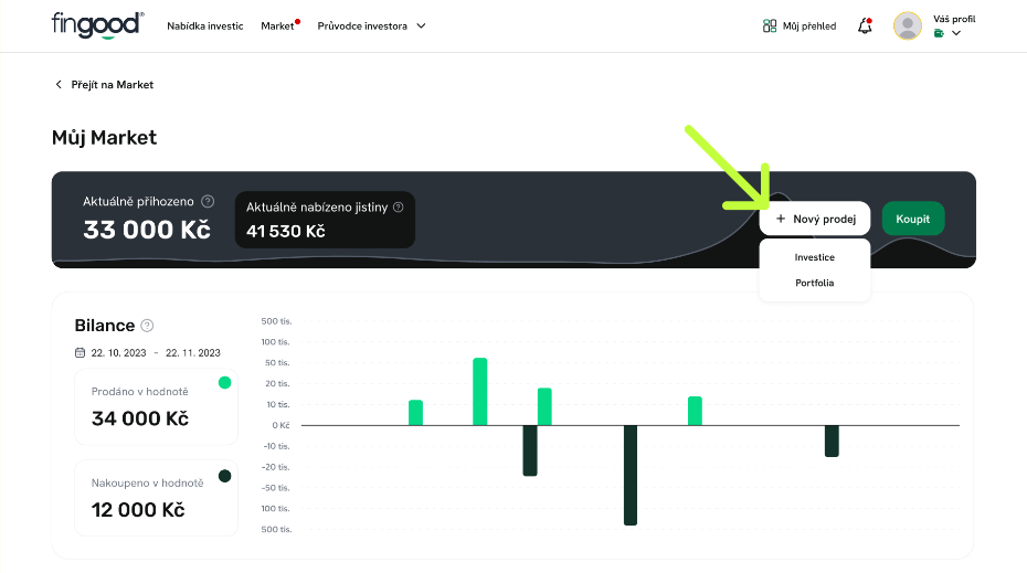 Prodej spustíte v části Můj Market – kliknutím na tlačítko „Nový prodej“. Investici můžete prodat také z detailu investice.