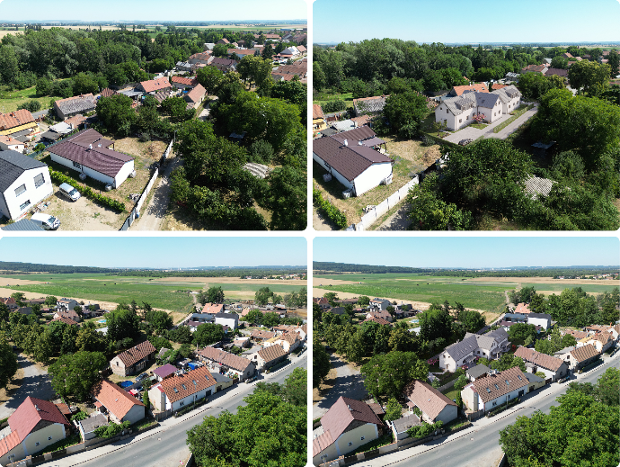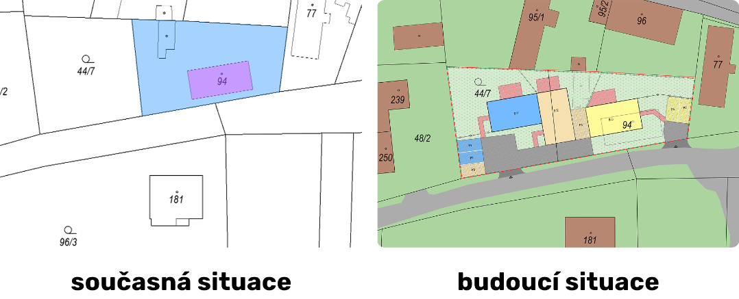 Úvěr bude zajištěn pozemky, na kterých vznikne nový developerský projekt. Na současných fotografiích můžete vidět jak aktuální stav nemovitostí, tak budoucí vizualizaci projektu podle katastru nemovitostí.