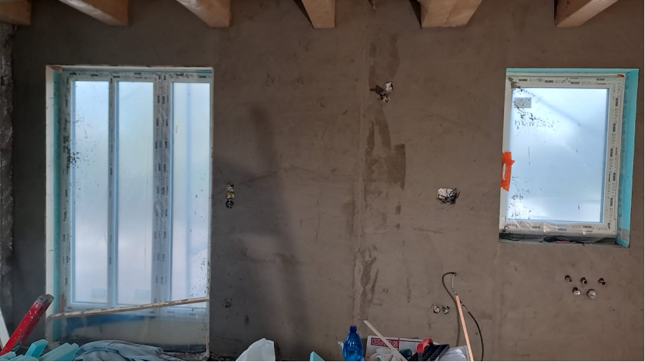 - Na této části proběhla montáž oken, práce na elektroinstalaci, rozvodech vody, podlahovém topení a momentálně jsou dokončovány vnitřní omítky a skladby podlah.