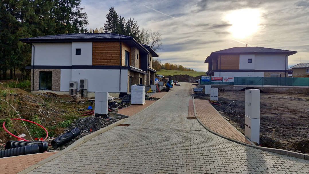 První etapa (4 domy) je ve fázi dokončovacích prací. Jsou hotové omítky, anhydritové podlahy, sádrokartonové stropy a kompletní rozvody s připojením na všechny sítě (elektro, voda, tlaková kanalizace). Domy už mají hotové i fasády, instalované venkovní žaluzie a garážová vrata.